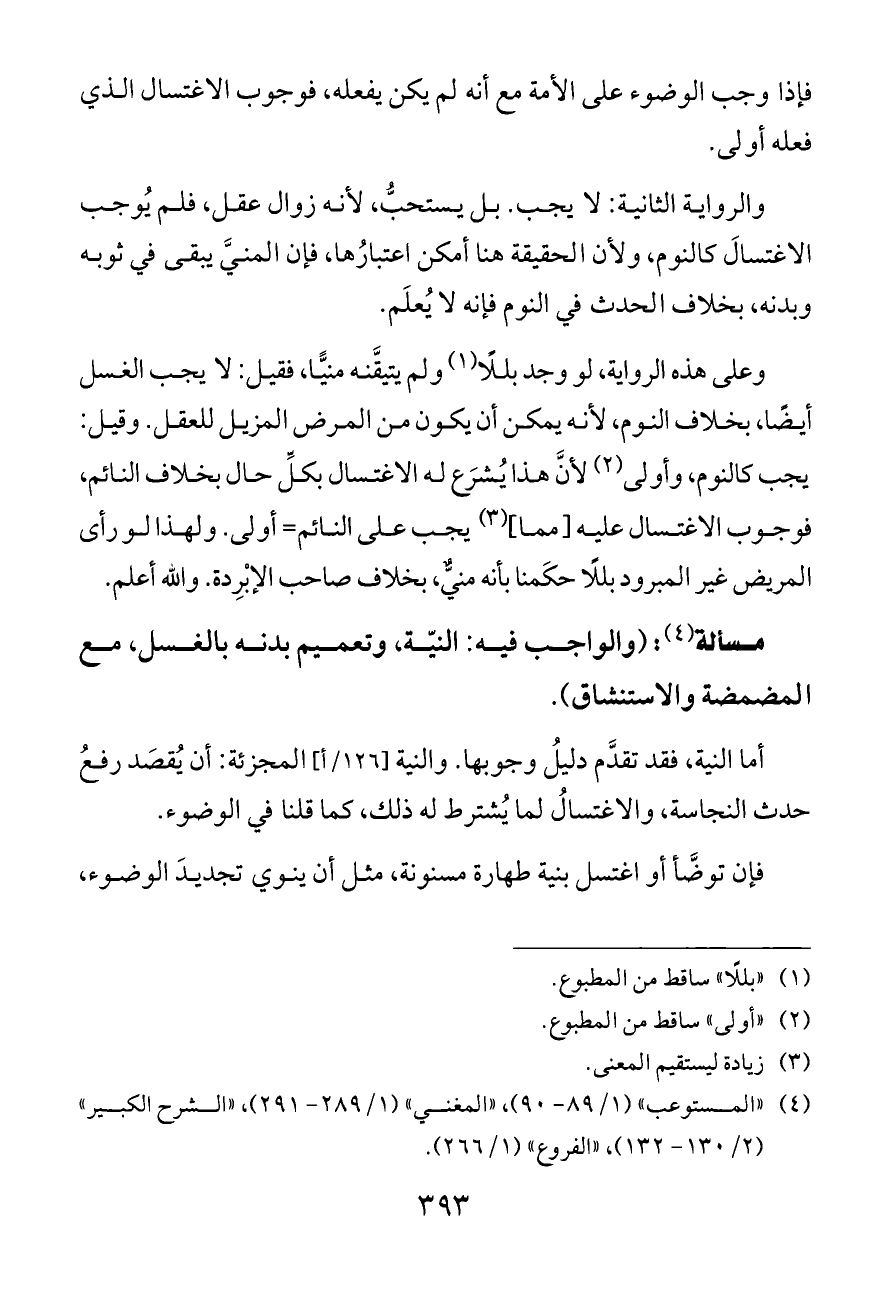 (¬٤) «المستوعب» (١/ ٨٩ - ٩٠)، «المغني» (١/ ٢٨٩ - ٢٩١)، «الشرح الكبير» (٢/ ١٣٠ - ١٣٢)، «الفروع» (١/ ٢٦٦).