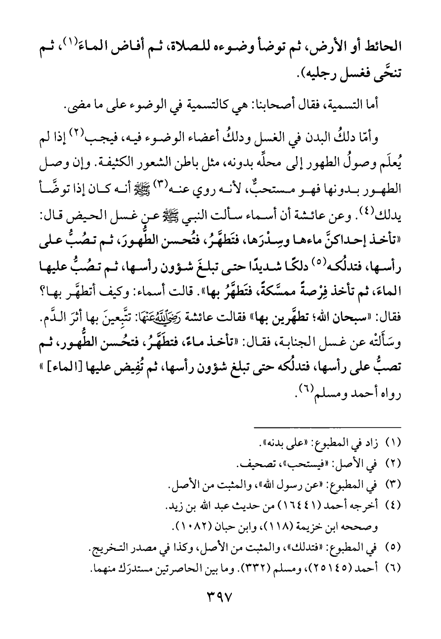 وعن عائشة أن أسماء سألت النبي - صلى الله عليه وسلم - عن غسل الحيض قال: «تأخذ إحداكنَّ ماءها وسِدْرَها، فتَطهَّرُ، فتُحسن الطُّهورَ، ثم تصُبُّ على رأسها، فتدلُكه (¬٥) دلكًا شديدًا حتى تبلغَ شؤون رأسها، ثم تصُبُّ عليها الماءَ، ثم تأخذ فِرْصةً ممسَّكةً، فتَطهَّرُ بها». قالت أسماء: وكيف أتطهَّر بها؟ فقال: «سبحان الله؛ تطهَّرين بها» فقالت عائشة - رضي الله عنها -: تتَّبِعينَ بها أثرَ الدَّم. وسَأَلتْه عن غسل الجنابة، فقال: «تأخذ ماءً، فتطَهَّرُ، فتحُسن الطُّهور، ثم تصبُّ على رأسها، فتدلُكه حتى تبلغ شؤون رأسها، ثم تُفِيض عليها [الماء]» رواه أحمد ومسلم (¬٦).