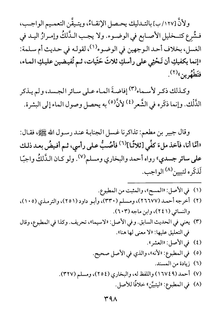 وكذلك ذكر لأسماء (¬٣) إفاضةَ الماء على سائر الجسد، ولم يذكر الدَّلْك. وإنما ذكَره في الشَّعر (¬٤) لأنَّ (¬٥) به يحصل وصول الماء إلى البشرة.