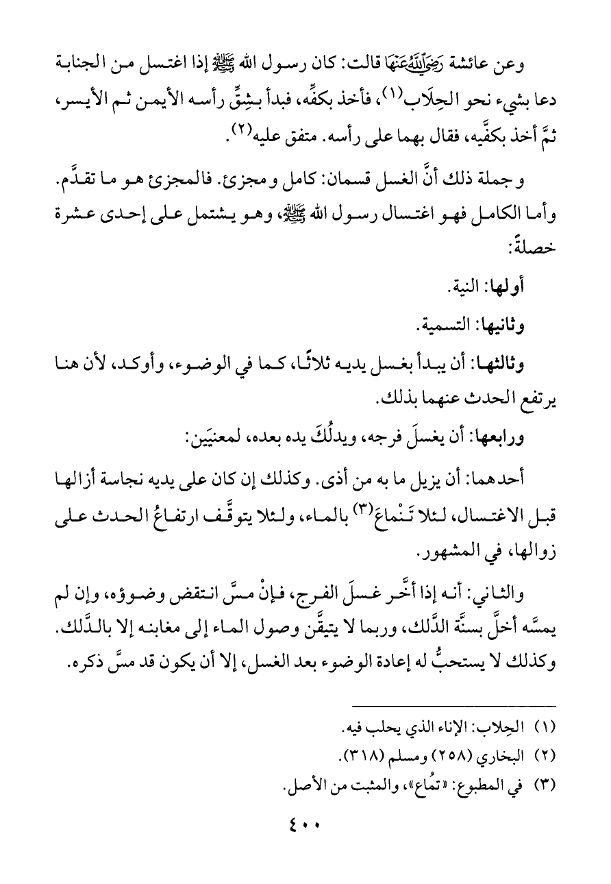 وعن عائشة - رضي الله عنها - قالت: كان رسول الله - صلى الله عليه وسلم - إذا اغتسل من الجنابة دعا بشيء نحو الحِلَاب (¬١)، فأخذ بكفِّه، فبدأ بشِقِّ رأسه الأيمن ثم الأيسر، ثمَّ أخذ بكفَّيه، فقال بهما على رأسه. متفق عليه (¬٢).