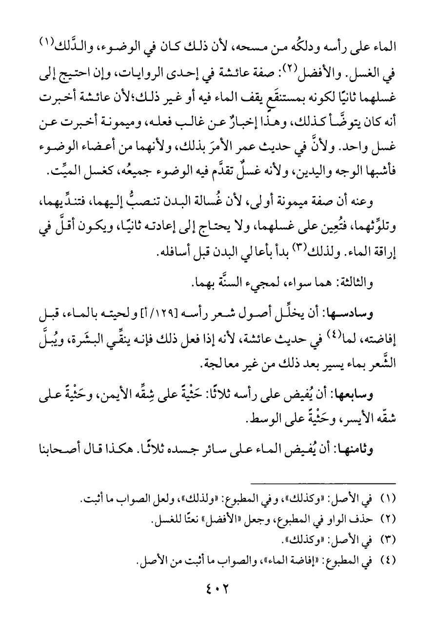 وعنه أن صفة ميمونة أولى، لأن غُسالة البدن تنصبُّ إليهما، فتندِّيهما، وتلوِّثهما، فتُعِين على غسلهما، ولا يحتاج إلى إعادته ثانيًا، ويكون أقلَّ في إراقة الماء. ولذلك (¬٣) بدأ بأعالي البدن قبل أسافله.