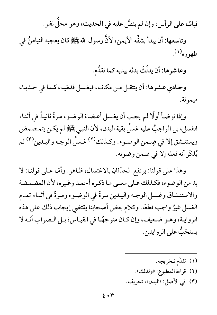وهذا على قولنا: يرتفع الحدَثانِ بالاغتسال، ظاهر. وأمّا على قولنا: لا بد من الوضوء، فكذلك على معنى ما ذكره أحمد وغيره، لأن المضمضة والاستنشاق وغسل الوجه واليدين مرةً في الوضوء ومرةً في أثناء تمام الغسل غيرُ واجب قطعًا. وكلام بعض أصحابنا يقتضي إيجاب ذلك على هذه الرواية، وهو ضعيف، وإن كان متوجهًا في القياس؛ بل الصواب أنه لا يستحَبُّ على الروايتين.