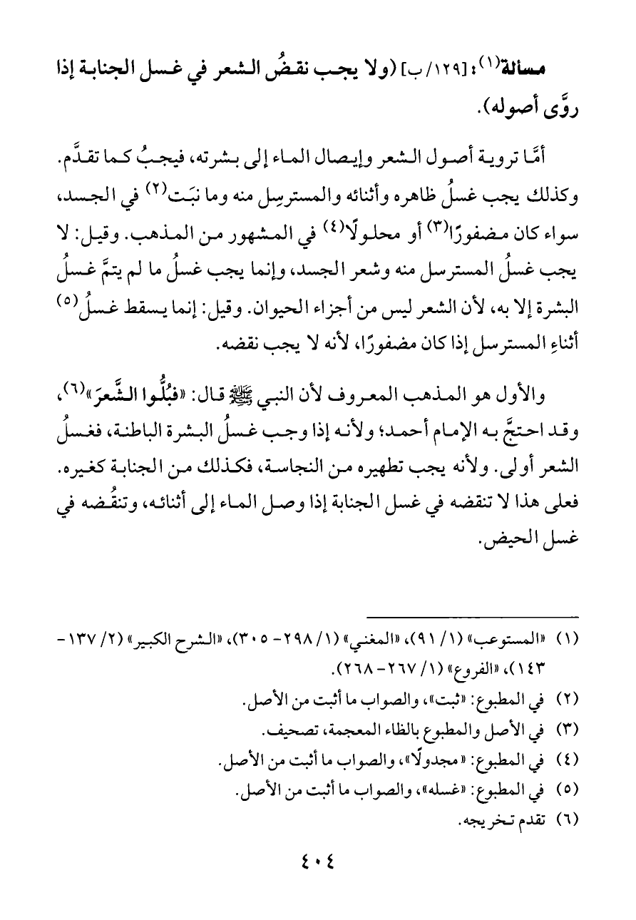أمَّا تروية أصول الشعر وإيصال الماء إلى بشرته، فيجبُ كما تقدَّم. وكذلك يجب غسلُ ظاهره وأثنائه والمسترسِل منه وما نبَت (¬٢) في الجسد، سواء كان مضفورًا (¬٣) أو محلولًا (¬٤) في المشهور من المذهب. وقيل: لا يجب غسلُ المسترسل منه وشعر الجسد، وإنما يجب غسلُ ما لم يتمَّ غسلُ البشرة إلا به، لأن الشعر ليس من أجزاء الحيوان. وقيل: إنما يسقط غسلُ (¬٥) أثناءِ المسترسل إذا كان مضفورًا، لأنه لا يجب نقضه.