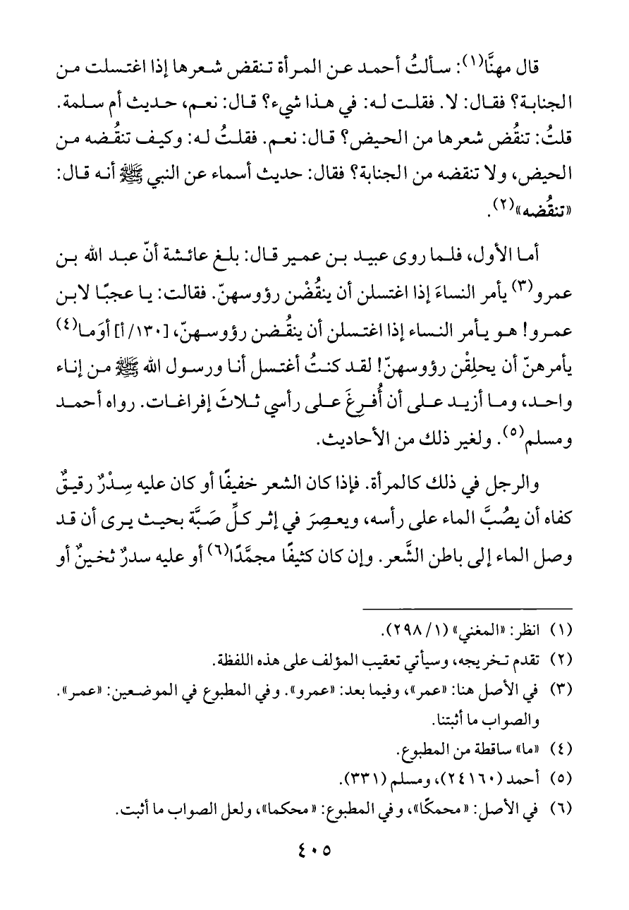 قال مهنَّا (¬١): سألتُ أحمد عن المرأة تنقض شعرها إذا اغتسلت من الجنابة؟ فقال: لا. فقلت له: في هذا شيء؟ قال: نعم، حديث أم سلمة. قلتُ: تنقُض شعرها من الحيض؟ قال: نعم. فقلتُ له: وكيف تنقُضه من الحيض، ولا تنقضه من الجنابة؟ فقال: حديث أسماء عن النبي - صلى الله عليه وسلم - أنه قال: «تنقُضه» (¬٢).