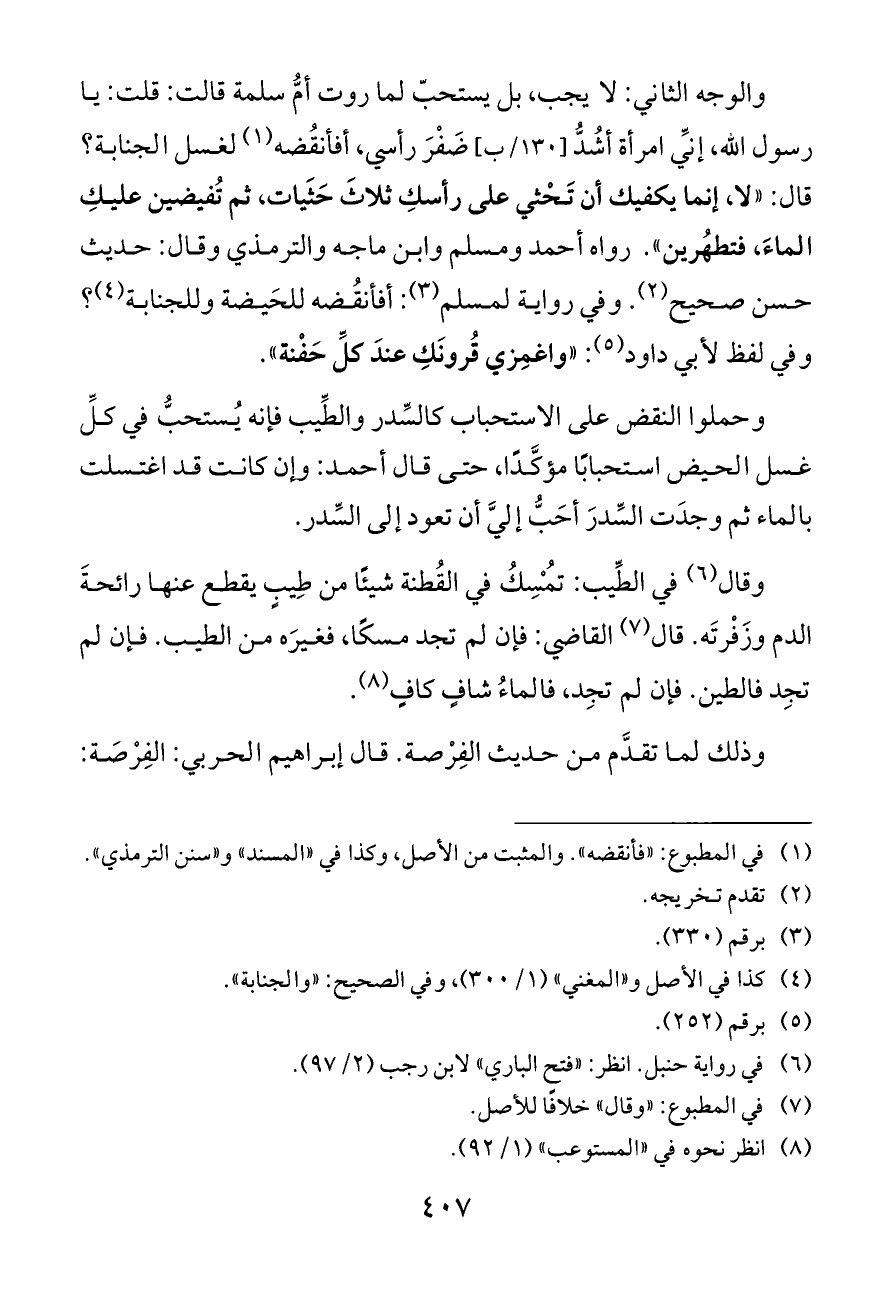 وحملوا النقض على الاستحباب كالسِّدر والطِّيب فإنه يُستحبُّ في كلِّ غسل الحيض استحبابًا مؤكَّدًا، حتى قال أحمد: وإن كانت قد اغتسلت بالماء ثم وجدَت السِّدرَ أحَبُّ إليَّ أن تعود إلى السِّدر.