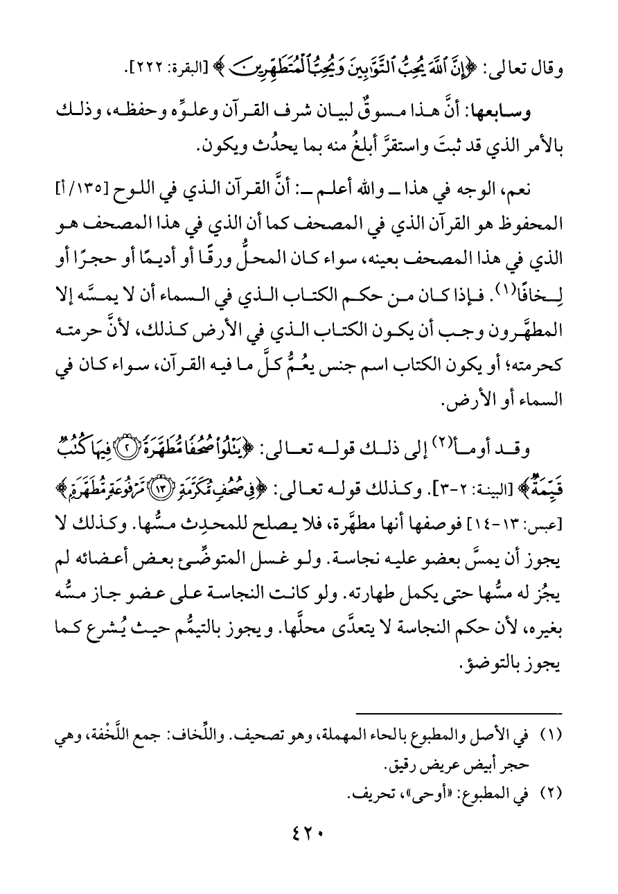 نعم، الوجه في هذا ــ والله أعلم ــ: أنَّ القرآن الذي في اللوح [١٣٥/أ] المحفوظ هو القرآن الذي في المصحف كما أن الذي في هذا المصحف هو الذي في هذا المصحف بعينه، سواء كان المحلُّ ورقًا أو أديمًا أو حجرًا أو لِخافًا (¬١). فإذا كان من حكم الكتاب الذي في السماء أن لا يمسَّه إلا المطهَّرون وجب أن يكون الكتاب الذي في الأرض كذلك، لأنَّ حرمته كحرمته؛ أو يكون الكتاب اسم جنس يعُمُّ كلَّ ما فيه القرآن، سواء كان في السماء أو الأرض.