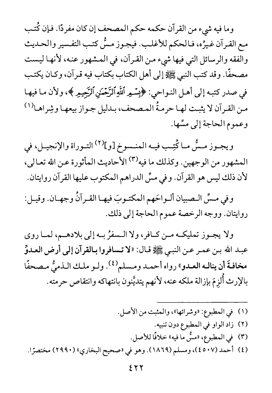 ولا يجوز تمليكه من كافر، ولا السفرُ به إلى بلادهم، لما روى عبد الله بن عمر عن النبي - صلى الله عليه وسلم - قال: «لا تسافروا بالقرآن إلى أرض العدوِّ مخافةَ أن يناله العدو» رواه أحمد ومسلم (¬٤). ولو ملك الذميُّ مصحفًا بالإرث أُلزِمَ بإزالة ملكه عنه، لأنهم يتديَّنون بانتهاكه وانتقاص حرمته.