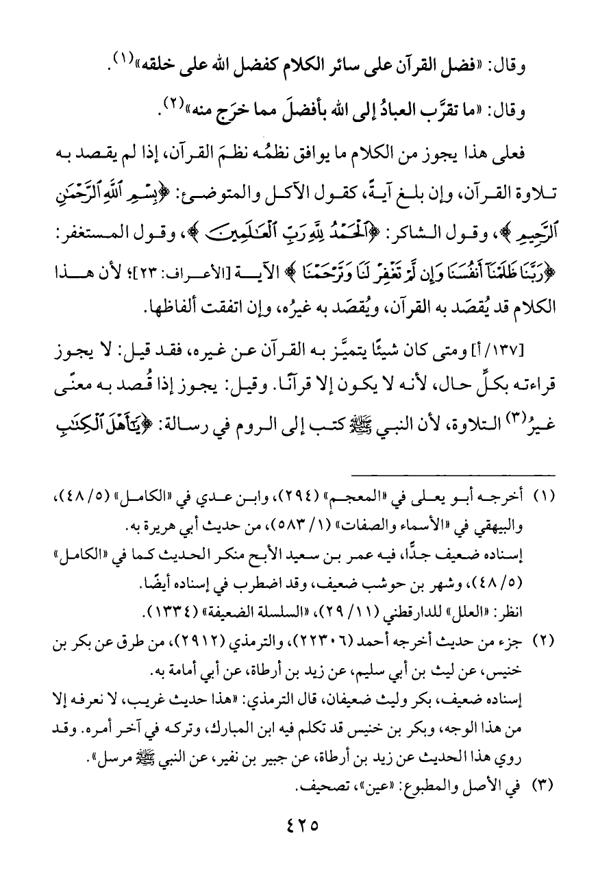 [١٣٧/أ] ومتى كان شيئًا يتميَّز به القرآن عن غيره، فقد قيل: لا يجوز قراءته بكلِّ حال، لأنه لا يكون إلا قرآنًا. وقيل: يجوز إذا قُصد به معنًى غيرُ (¬٣) التلاوة، لأن النبي - صلى الله عليه وسلم - كتب إلى الروم في رسالة: {يَاأَهْلَ الْكِتَابِ