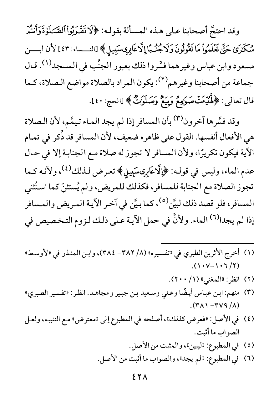 وقد فسَّرها آخرون (¬٣) بأن المسافر إذا لم يجد الماء تيمَّم، لأن الصلاة هي الأفعال أنفسها. القول على ظاهره ضعيف، لأن المسافر قد ذُكر في تمام الآية فيكون تكريرًا، ولأن المسافر لا تجوز له صلاة مع الجنابة إلا في حال عدم الماء، وليس في قوله: {إِلَّا عَابِرِي سَبِيلٍ} تعرض لذلك (¬٤)، ولأنه كما تجوز الصلاة مع الجنابة للمسافر، فكذلك للمريض، ولم يُستثنَ كما استُثني المسافر، فلو قصد ذلك لبيَّن (¬٥)، كما بيَّن في آخر الآية المريض والمسافر إذا لم يجدا (¬٦) الماء. ولأنَّ في حمل الآية على ذلك لزوم التخصيص في