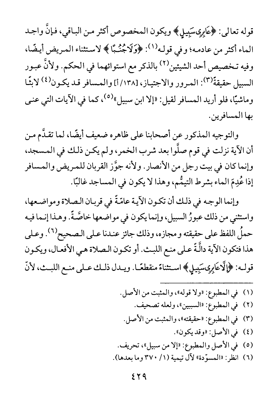 قوله تعالى: {عَابِرِي سَبِيلٍ} ويكون المخصوص أكثر من الباقي، فإنَّ واجد الماء أكثر من عادمه؛ وفي قوله (¬١): {وَلَا جُنُبًا} لاستثناء المريض أيضًا، وفيه تخصيص أحد الشيئين (¬٢) بالذكر مع استوائهما في الحكم. ولأنَّ عبور السبيل حقيقةً (¬٣): المرور والاجتياز، [١٣٨/أ] والمسافر قد يكون (¬٤) لابثًا وماشيًا، فلو أريد المسافر لقيل: «إلا ابن سبيل» (¬٥)، كما في الآيات التي عنى بها المسافرين.
