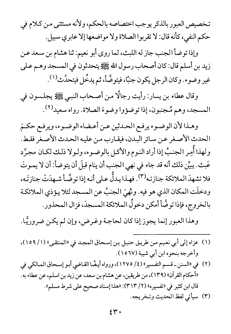 وإذا توضأ الجنب جاز له اللبث، لما روى أبو نعيم: ثنا هشام بن سعد عن زيد بن أسلم قال: كان أصحاب رسول الله - صلى الله عليه وسلم - يتحدثون في المسجد وهم على غير وضوء. وكان الرجل يكون جنبًا، فيتوضَّأ، ثم يدخُل فيتحدَّث (¬١).
