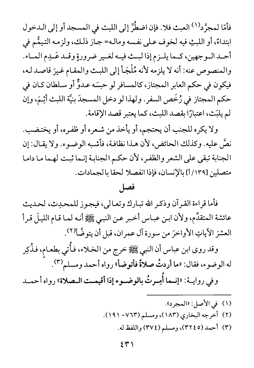 فأمّا لمجرَّد (¬١) العبث فلا. فإن اضطُرَّ إلى اللبث في المسجد أو إلى الدخول ابتداءً، أو اللبثِ فيه لخوف على نفسه وماله= جاز ذلك، ولزمه التيمُّم في أحد الوجهين، كما يلزم إذا لبث فيه لغير ضرورةٍ وقد عَدِم الماء. والمنصوص عنه: أنه لا يلزمه لأنه مُلْجَأ إلى اللبث والمقام غيرَ قاصد له، فيكون في حكم العابر المجتاز، كالمسافر لو حبسَه عدوٌّ أو سلطان كان في حكم المجتاز في رُخَص السفر. ولهذا لو دخل المسجدَ بنيَّة اللبث أثِمَ، وإن لم يلبَث، اعتبارًا بقصد اللبث، كما يعتبر قصد الإقامة.