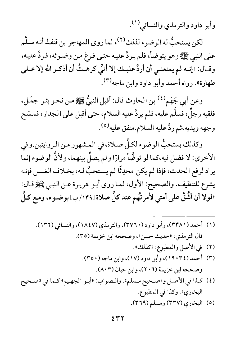 وكذلك يستحبُّ الوضوء لكلِّ صلاة، في المشهور من الروايتين. وفي الأخرى: لا فضل فيه، كما لو توضَّأ مرارًا ولم يصلِّ بينهما، ولأنَّ الوضوء إنما يراد لرفع الحدث، فإذا لم يكن محدِثًا لم يستحبَّ له، بخلاف الغسل فإنه يشرع للتنظيف. والصحيح: الأول، لما روى أبو هريرة عن النبي - صلى الله عليه وسلم - قال: «لولا أن أشُقَّ على أمتي لأمرتُهم عند كلِّ صلاة [١٣٩/ب] بوضوء، ومع كلِّ