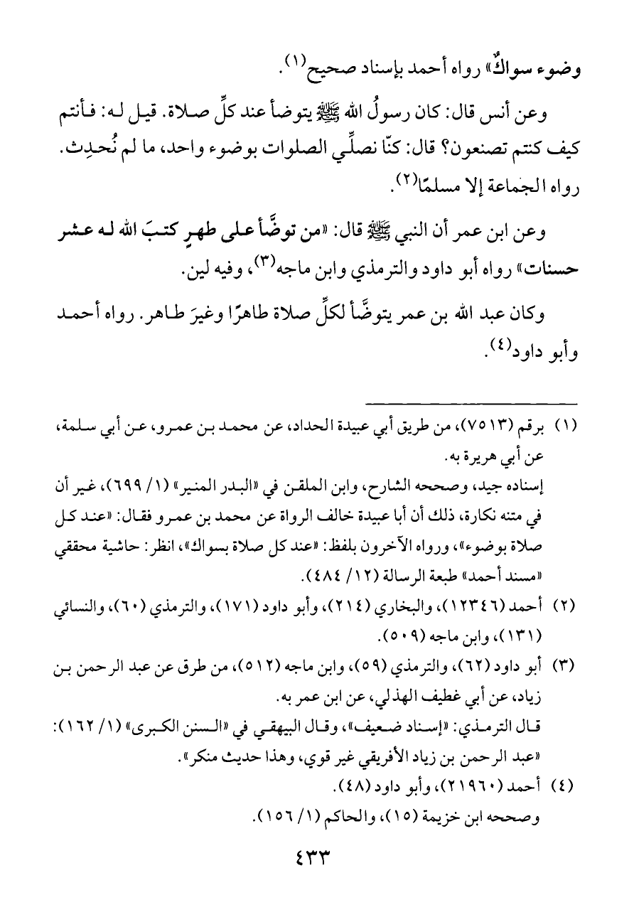 إسناده جيد، وصححه الشارح، وابن الملقن في «البدر المنير» (١/ ٦٩٩)، غير أن في متنه نكارة، ذلك أن أبا عبيدة خالف الرواة عن محمد بن عمرو فقال: «عند كل صلاة بوضوء»، ورواه الآخرون بلفظ: «عند كل صلاة بسواك»، انظر: حاشية محققي «مسند أحمد» طبعة الرسالة (١٢/ ٤٨٤).