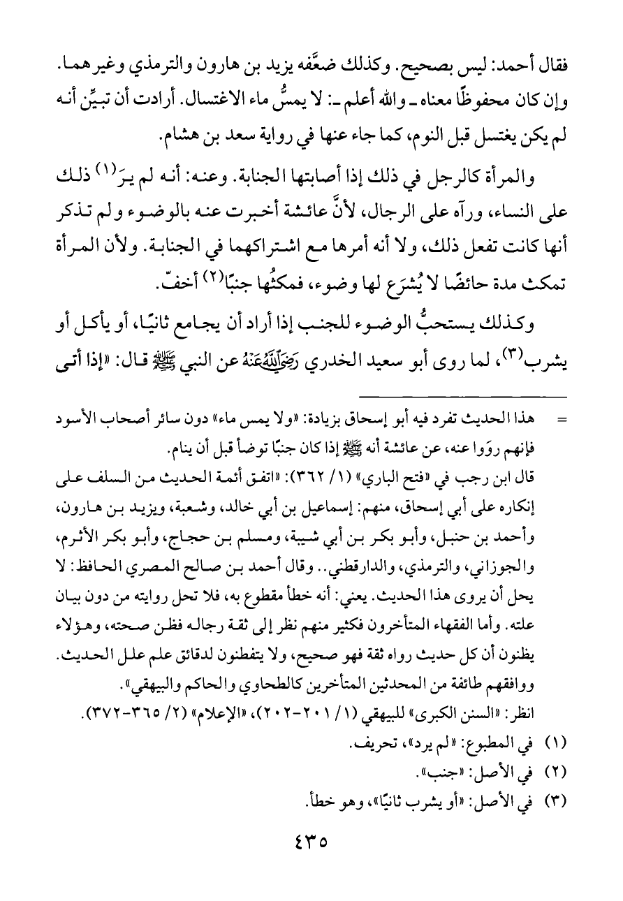 فقال أحمد: ليس بصحيح. وكذلك ضعَّفه يزيد بن هارون والترمذي وغيرهما. وإن كان محفوظًا معناه ــ والله أعلم ــ: لا يمسُّ ماء الاغتسال. أرادت أن تبيِّن أنه لم يكن يغتسل قبل النوم، كما جاء عنها في رواية سعد بن هشام.