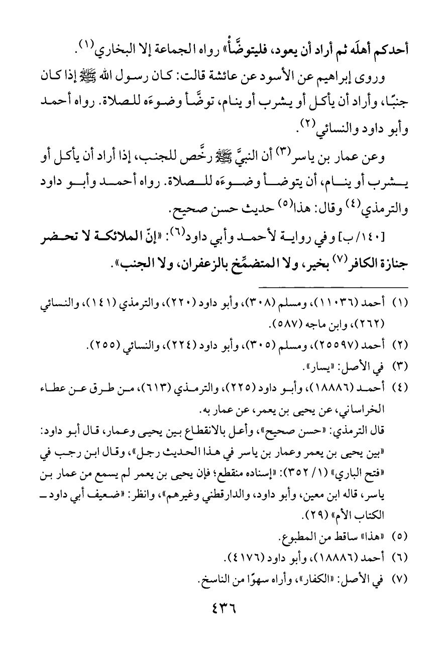 وعن عمار بن ياسر (¬٣) أن النبيَّ - صلى الله عليه وسلم - رخَّص للجنب، إذا أراد أن يأكل أو يشرب أو ينام، أن يتوضأ وضوءَه للصلاة. رواه أحمد وأبو داود والترمذي (¬٤) وقال: هذا (¬٥) حديث حسن صحيح.
