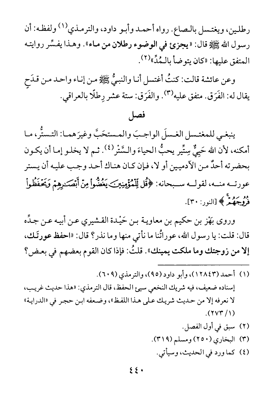 رطلين، ويغتسل بالصاع. رواه أحمد وأبو داود، والترمذي (¬١) ولفظه: أن رسول الله - صلى الله عليه وسلم - قال: «يجزئ في الوضوء رطلان من ماء». وهذا يفسِّر روايته المتفق عليها: «كان يتوضأ بالمُدِّ» (¬٢).