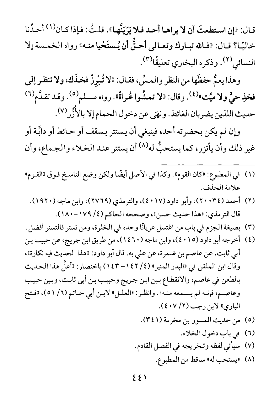 قال: «إن استطعتَ أن لا يراها أحد فلا يَرَيَنَّها». قلتُ: فإذا كان (¬١) أحدُنا خاليًا؟ قال: «فالله تبارك وتعالى أحقُّ أن يُستَحْيا منه» رواه الخمسة إلا النسائي (¬٢). وذكره البخاري تعليقًا (¬٣).