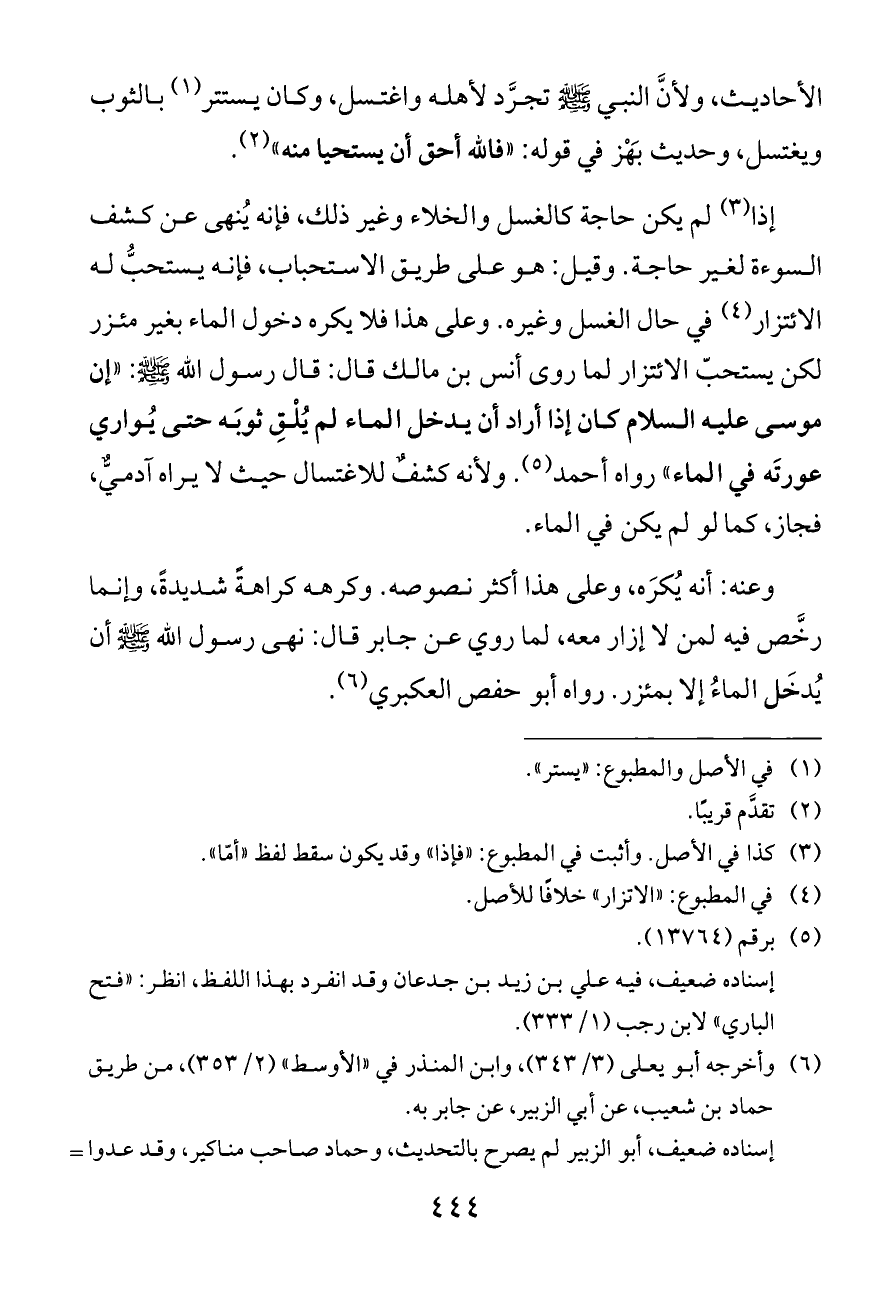 إذا (¬٣) لم يكن حاجة كالغسل والخلاء وغير ذلك، فإنه يُنهى عن كشف السوءة لغير حاجة. وقيل: هو على طريق الاستحباب، فإنه يستحبُّ له الائتزار (¬٤) في حال الغسل وغيره. وعلى هذا فلا يكره دخول الماء بغير مئزر لكن يستحبّ الائتزار لما روى أنس بن مالك قال: قال رسول الله - صلى الله عليه وسلم -: «إن موسى عليه السلام كان إذا أراد أن يدخل الماء لم يُلْقِ ثوبَه حتى يُواري عورتَه في الماء» رواه أحمد (¬٥). ولأنه كشفٌ للاغتسال حيث لا يراه آدميٌّ، فجاز، كما لو لم يكن في الماء.