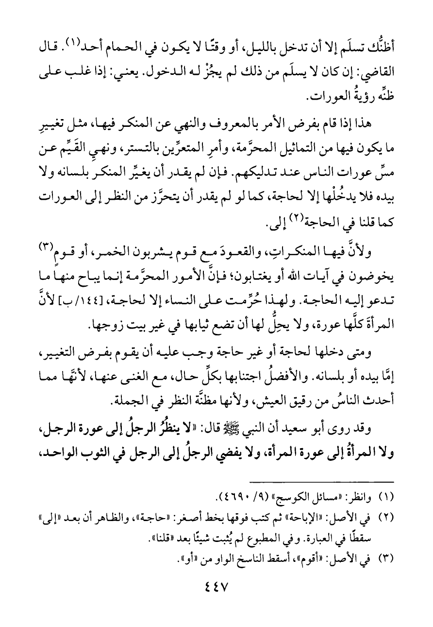 هذا إذا قام بفرض الأمر بالمعروف والنهي عن المنكر فيها، مثل تغييرِ ما يكون فيها من التماثيل المحرَّمة، وأمرِ المتعرِّين بالتستر، ونهيِ القَيِّم عن مسِّ عورات الناس عند تدليكهم. فإن لم يقدر أن يغيِّر المنكر بلسانه ولا بيده فلا يدخُلْها إلا لحاجة، كما لو لم يقدر أن يتحرَّز من النظر إلى العورات كما قلنا في الحاجة (¬٢) إلى.