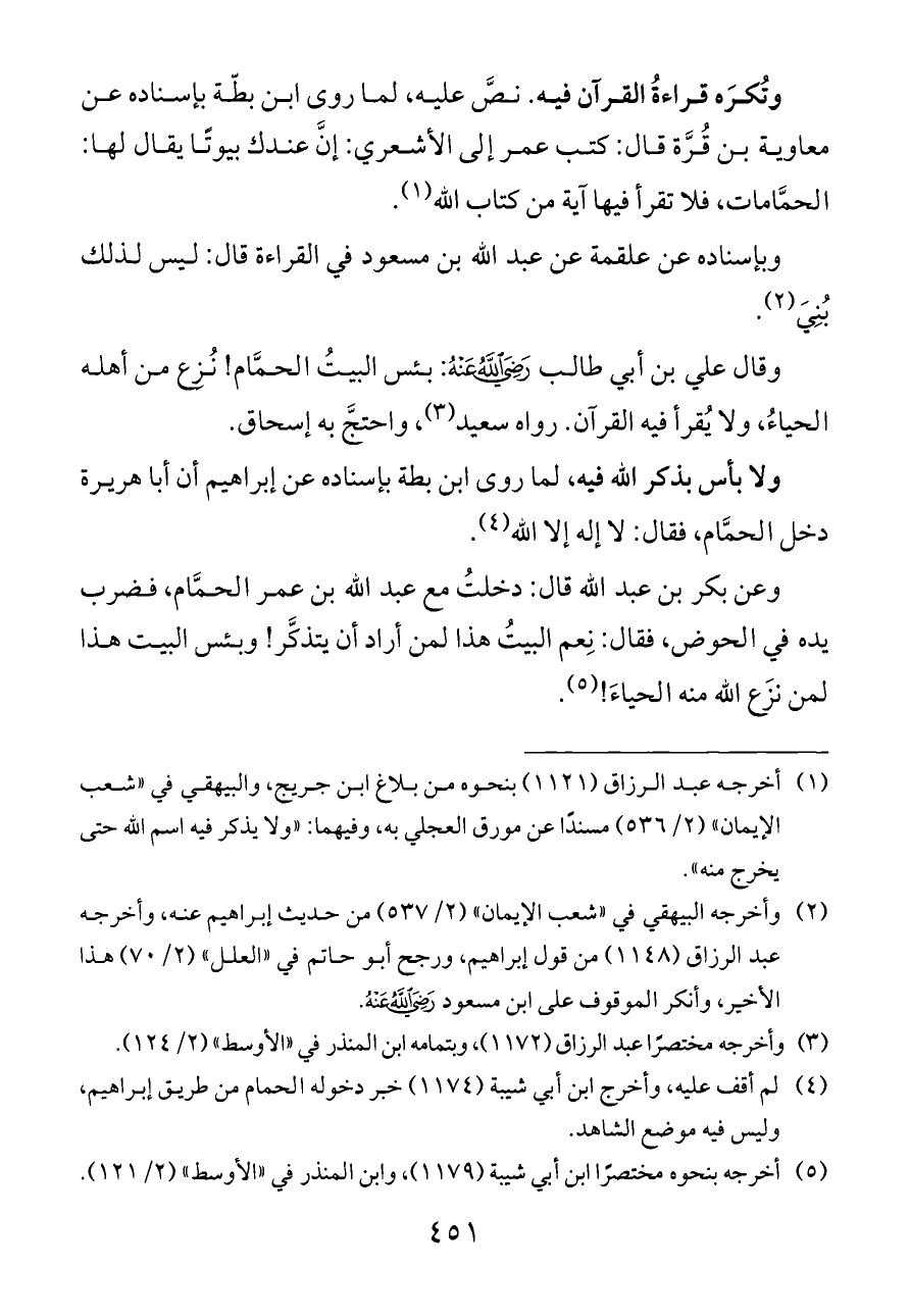 وقال علي بن أبي طالب - رضي الله عنه -: بئس البيتُ الحمَّام! نُزِع من أهله الحياءُ، ولا يُقرأ فيه القرآن. رواه سعيد (¬٣)، واحتجَّ به إسحاق.