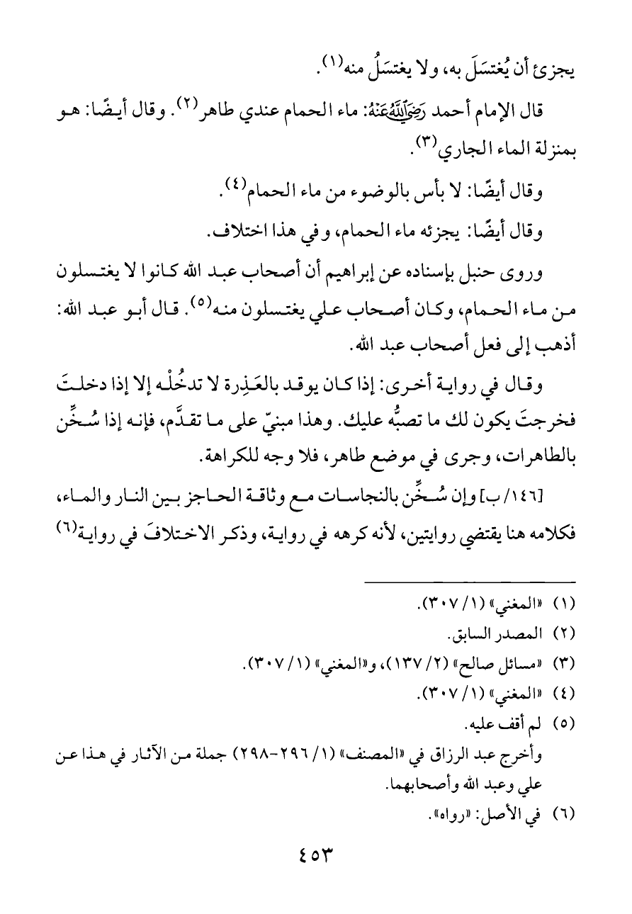 وروى حنبل بإسناده عن إبراهيم أن أصحاب عبد الله كانوا لا يغتسلون من ماء الحمام، وكان أصحاب علي يغتسلون منه (¬٥).