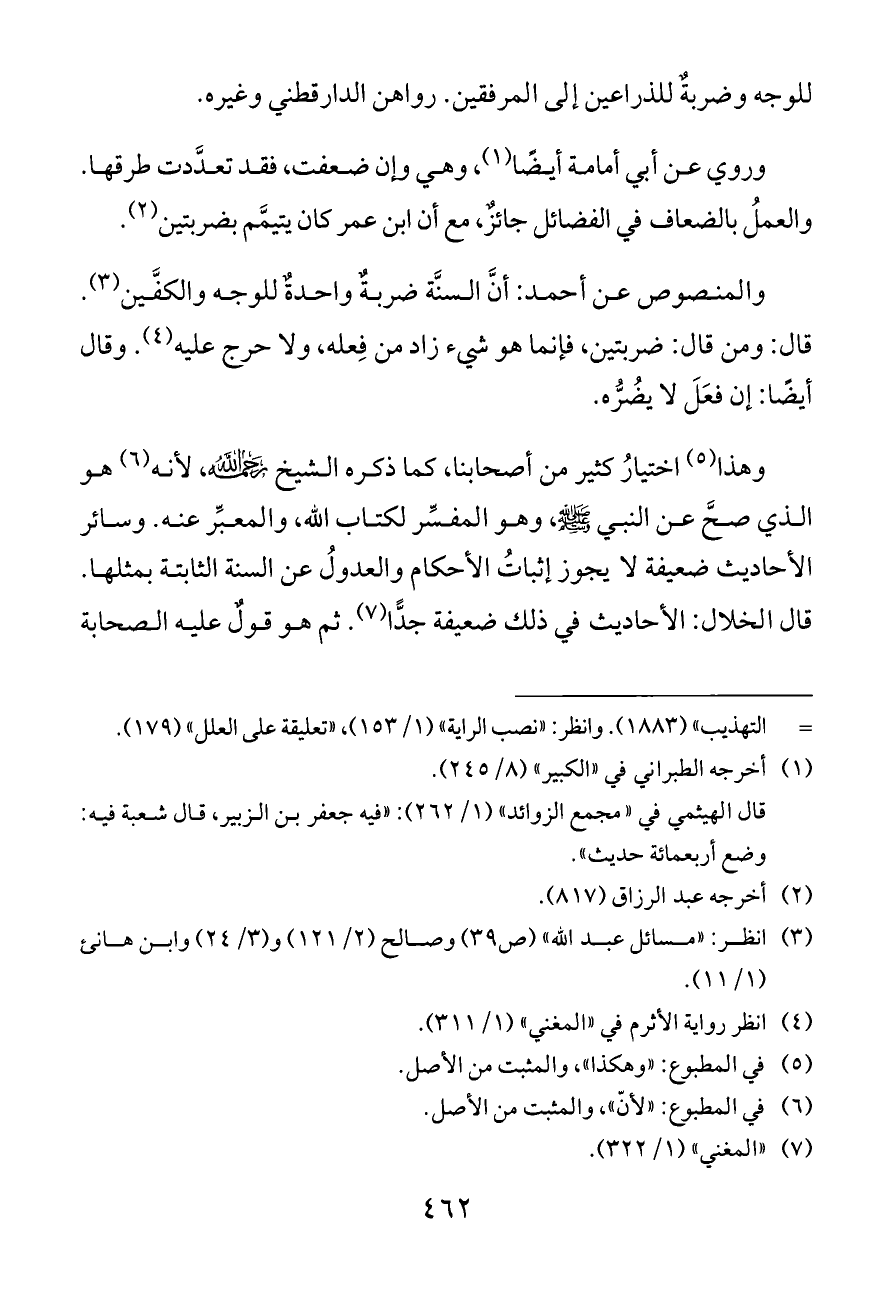 وهذا (¬٥) اختيارُ كثير من أصحابنا، كما ذكره الشيخ - رحمه الله -، لأنه (¬٦) هو الذي صحَّ عن النبي - صلى الله عليه وسلم -، وهو المفسِّر لكتاب الله، والمعبِّر عنه. وسائر الأحاديث ضعيفة لا يجوز إثباتُ الأحكام والعدولُ عن السنة الثابتة بمثلها. قال الخلال: الأحاديث في ذلك ضعيفة جدًّا (¬٧). ثم هو قولٌ عليه الصحابة
