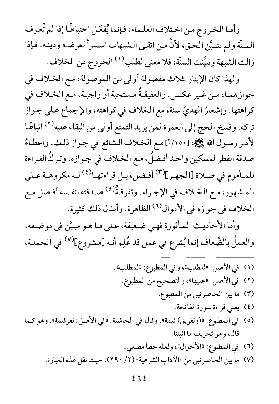 ولهذا كان الإيتار بثلاث مفصولة أولى من الموصولة، مع الخلاف في جوازهما، من غير عكس. والعقيقةُ مستحبة أو واجبة، مع الخلاف في كراهتها. وإشعارُ الهديِّ سنة، مع الخلاف في كراهته، والإجماع على جواز تركه. وفسخ الحج إلى العمرة لمن يريد التمتع أولى من البقاء عليه (¬٢) اتباعًا لأمر رسول الله - صلى الله عليه وسلم -، [١٥٠/أ] مع الخلاف الشائع في جواز ذلك. وإعطاءُ صدقة الفطر لمسكين واحد أفضلُ، مع الخلاف في جوازه. وتركُ القراءة للمأموم في صلاة [الجهر] (¬٣) أفضل، بل قراءتها (¬٤) له مكروهة على المشهور، مع الخلاف في الإجزاء. وتفرقةُ (¬٥) صدقته بنفسه أفضل مع الخلاف في جوازه في الأموال (¬٦) الظاهرة. وأمثال ذلك كثيرة.