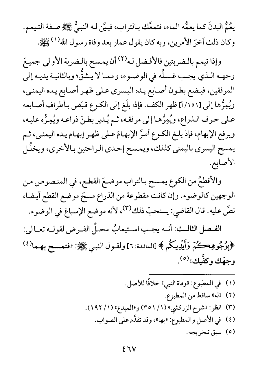 الفصل الثالث: أنه يجب استيعابُ محلِّ الفرض لقوله تعالى: {بِوُجُوهِكُمْ وَأَيْدِيكُمْ} [المائدة: ٦] ولقول النبي - صلى الله عليه وسلم -: «فتمسح بهما (¬٤) وجهَك وكفَّيك» (¬٥).