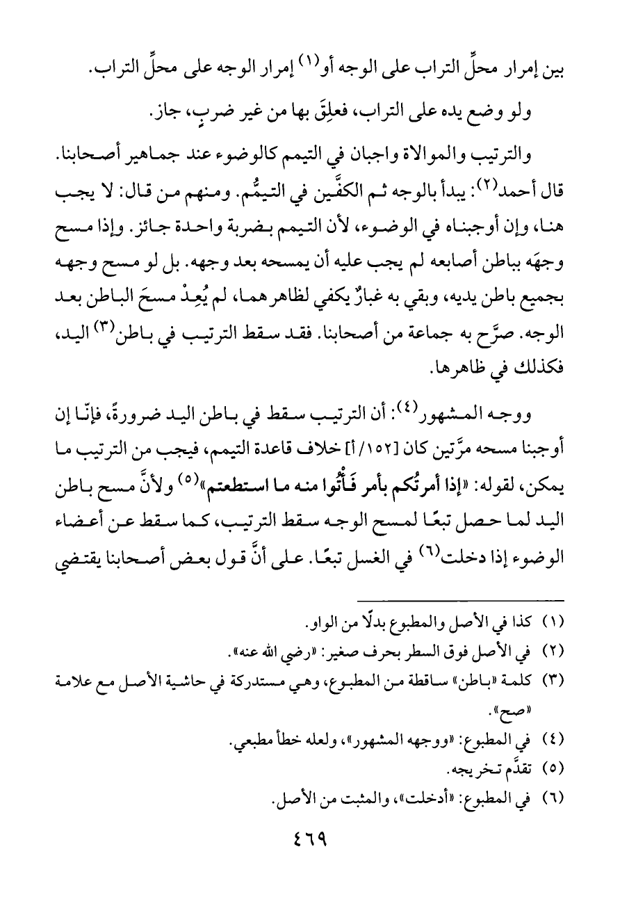 ووجه المشهور (¬٤): أن الترتيب سقط في باطن اليد ضرورةً، فإنّا إن أوجبنا مسحه مرَّتين كان [١٥٢/أ] خلاف قاعدة التيمم، فيجب من الترتيب ما يمكن، لقوله: «إذا أمرتُكم بأمر فَأْتُوا منه ما استطعتم» (¬٥) ولأنَّ مسح باطن اليد لما حصل تبعًا لمسح الوجه سقط الترتيب، كما سقط عن أعضاء الوضوء إذا دخلت (¬٦) في الغسل تبعًا. على أنَّ قول بعض أصحابنا يقتضي