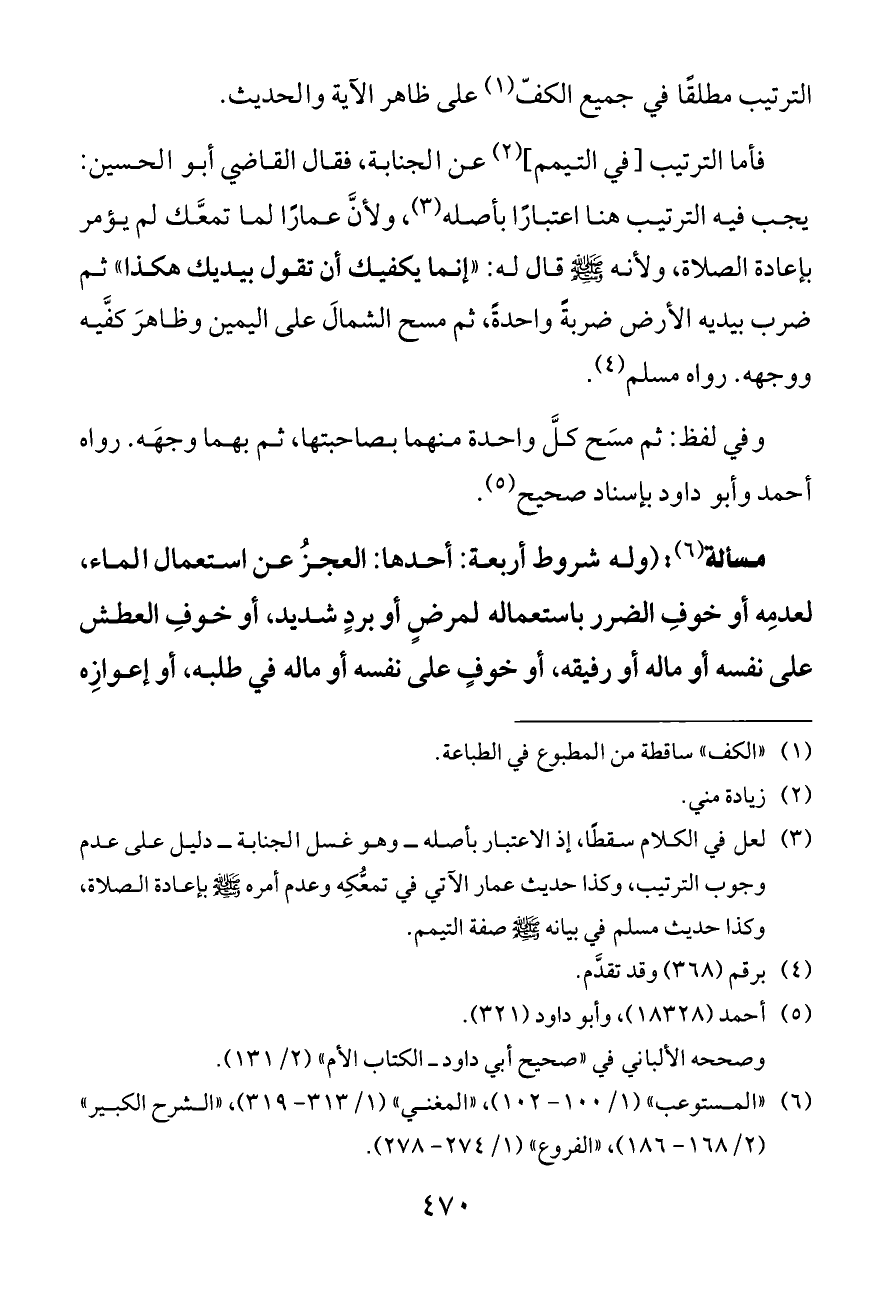 (¬٦) «المستوعب» (١/ ١٠٠ - ١٠٢)، «المغني» (١/ ٣١٣ - ٣١٩)، «الشرح الكبير» (٢/ ١٦٨ - ١٨٦)، «الفروع» (١/ ٢٧٤ - ٢٧٨).