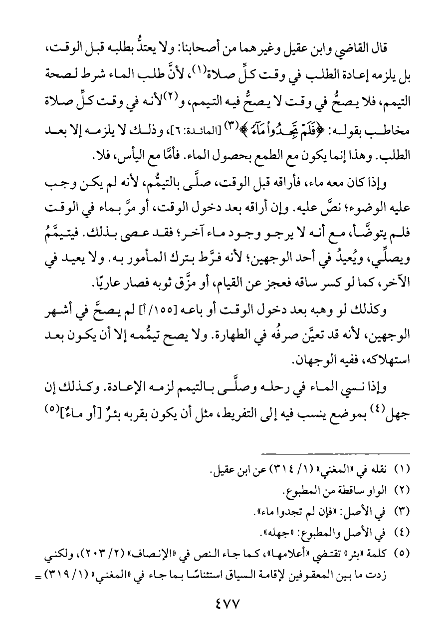 (¬٥) كلمة «بئر» تقتضي «أعلامها»، كما جاء النص في «الإنصاف» (٢/ ٢٠٣)، ولكني زدت ما بين المعقوفين لإقامة السياق استئناسًا بما جاء في «المغني» (١/ ٣١٩) و «الشرح الكبير» (٢/ ٢٠٣).