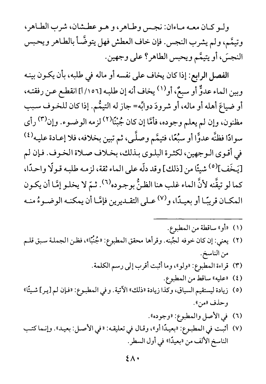 الفصل الرابع: إذا كان يخاف على نفسه أو ماله في طلبه، بأن يكون بينه وبين الماء عدوٌّ أو سبعٌ، أو (¬١) يخاف أنه إن طلبه [١٥٦/أ] انقطع عن رفقته، أو ضياعَ أهله أو ماله، أو شرودَ دوابِّه= جاز له التيمُّم. إذا كان للخوف ٠ سبب مظنون، وإن لم يعلم وجوده، فأمَّا إن كان جُبْنًا (¬٢) لزمه الوضوء. وإن (¬٣) رأى سوادًا فظنَّه عدوًّا أو سبُعًا، فتيمَّم وصلَّى، ثم تبين بخلافه، فلا إعادة عليه (¬٤) في أقوى الوجهين، لكثرة البلوى بذلك، بخلاف صلاة الخوف. فإن لم [يَخَف] (¬٥) شيئًا من [ذلك] وقد دلّه على الماء ثقة، لزمه طلبه قولًا واحدًا، كما لو تيقَّنه لأنَّ الماء غلب هنا الظنُّ بوجوده (¬٦). ثمّ لا يخلو إمَّا أن يكون المكان قريبًا أو بعيدًا، و (¬٧) على التقديرين فإمَّا أن يمكنه الوضوءُ منه