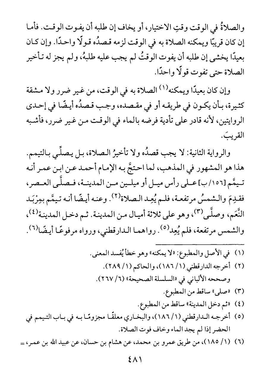 والرواية الثانية: لا يجب قصدُه ولا تأخيرُ الصلاة، بل يصلِّي بالتيمم. هذا هو المشهور في المذهب، لما احتجَّ به الإمام أحمد عن ابن عمر أنه تيمَّم [١٥٦/ب] على رأس ميل أو ميلين من المدينة، فصلَّى العصر، فقدِمَ والشمسُ مرتفعة، فلم يُعِد الصلاة (¬٢). وعنه أيضًا أنه تيمَّم بمِرْبَد النَّعَم، وصلَّى (¬٣)، وهو على ثلاثة أميال من المدينة. ثم دخل المدينة (¬٤)، والشمس مرتفعة، فلم يُعِد (¬٥). رواهما الدارقطني، ورواه مرفوعًا أيضًا (¬٦).