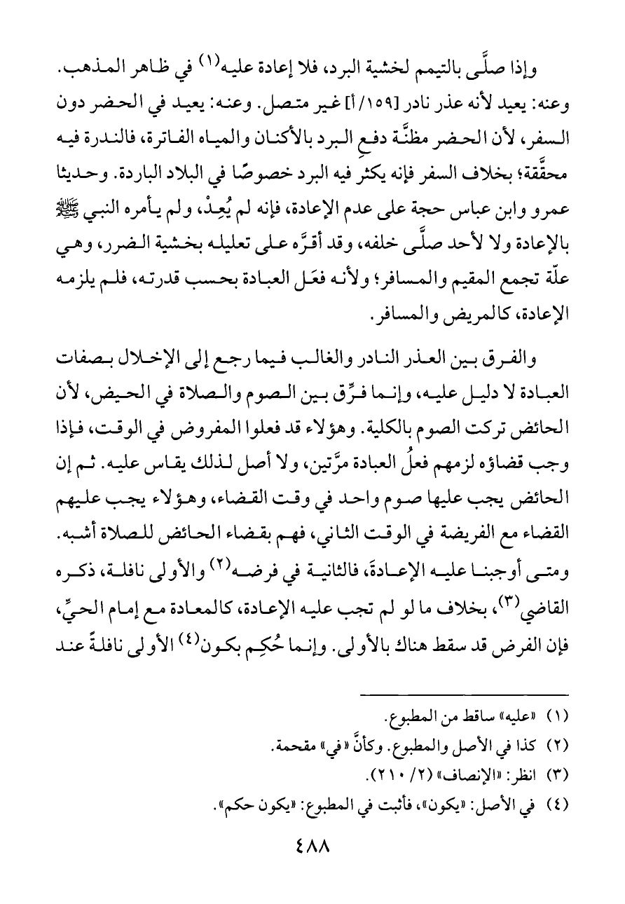 والفرق بين العذر النادر والغالب فيما رجع إلى الإخلال بصفات العبادة لا دليل عليه، وإنما فرِّق بين الصوم والصلاة في الحيض، لأن الحائض تركت الصوم بالكلية. وهؤلاء قد فعلوا المفروض في الوقت، فإذا وجب قضاؤه لزمهم فعلُ العبادة مرَّتين، ولا أصل لذلك يقاس عليه. ثم إن الحائض يجب عليها صوم واحد في وقت القضاء، وهؤلاء يجب عليهم القضاء مع الفريضة في الوقت الثاني، فهم بقضاء الحائض للصلاة أشبه. ومتى أوجبنا عليه الإعادةَ، فالثانية في فرضه (¬٢) والأولى نافلة، ذكره القاضي (¬٣)، بخلاف ما لو لم تجب عليه الإعادة، كالمعادة مع إمام الحيِّ، فإن الفرض قد سقط هناك بالأولى. وإنما حُكِم بكون (¬٤) الأولى نافلةً عند