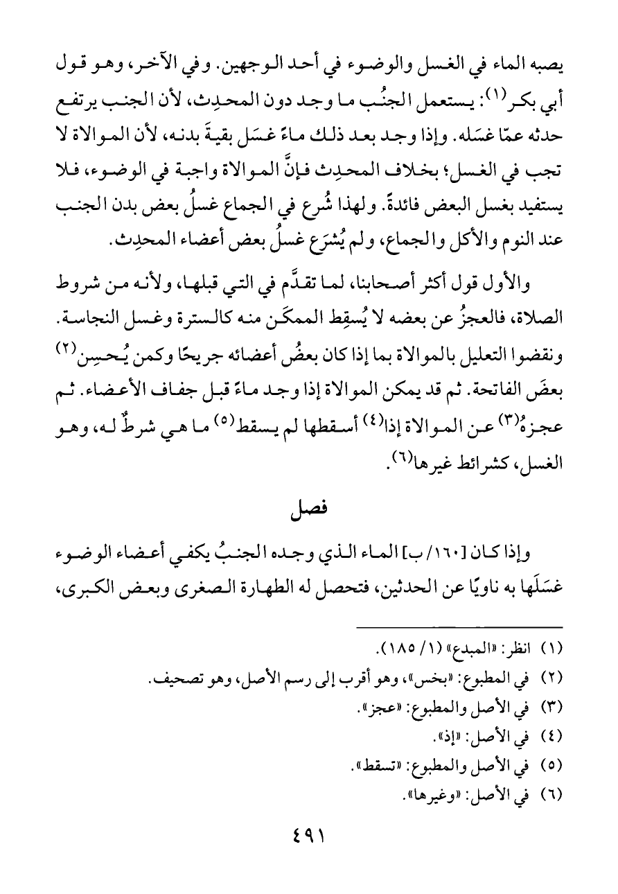 يصبه الماء في الغسل والوضوء في أحد الوجهين. وفي الآخر، وهو قول أبي بكر (¬١): يستعمل الجنُب ما وجد دون المحدِث، لأن الجنب يرتفع حدثه عمّا غسَله. وإذا وجد بعد ذلك ماءً غسَل بقيةَ بدنه، لأن الموالاة لا تجب في الغسل؛ بخلاف المحدِث فإنَّ الموالاة واجبة في الوضوء، فلا يستفيد بغسل البعض فائدةً. ولهذا شُرع في الجماع غسلُ بعض بدن الجنب عند النوم والأكل والجماع، ولم يُشرَع غسلُ بعض أعضاء المحدِث.