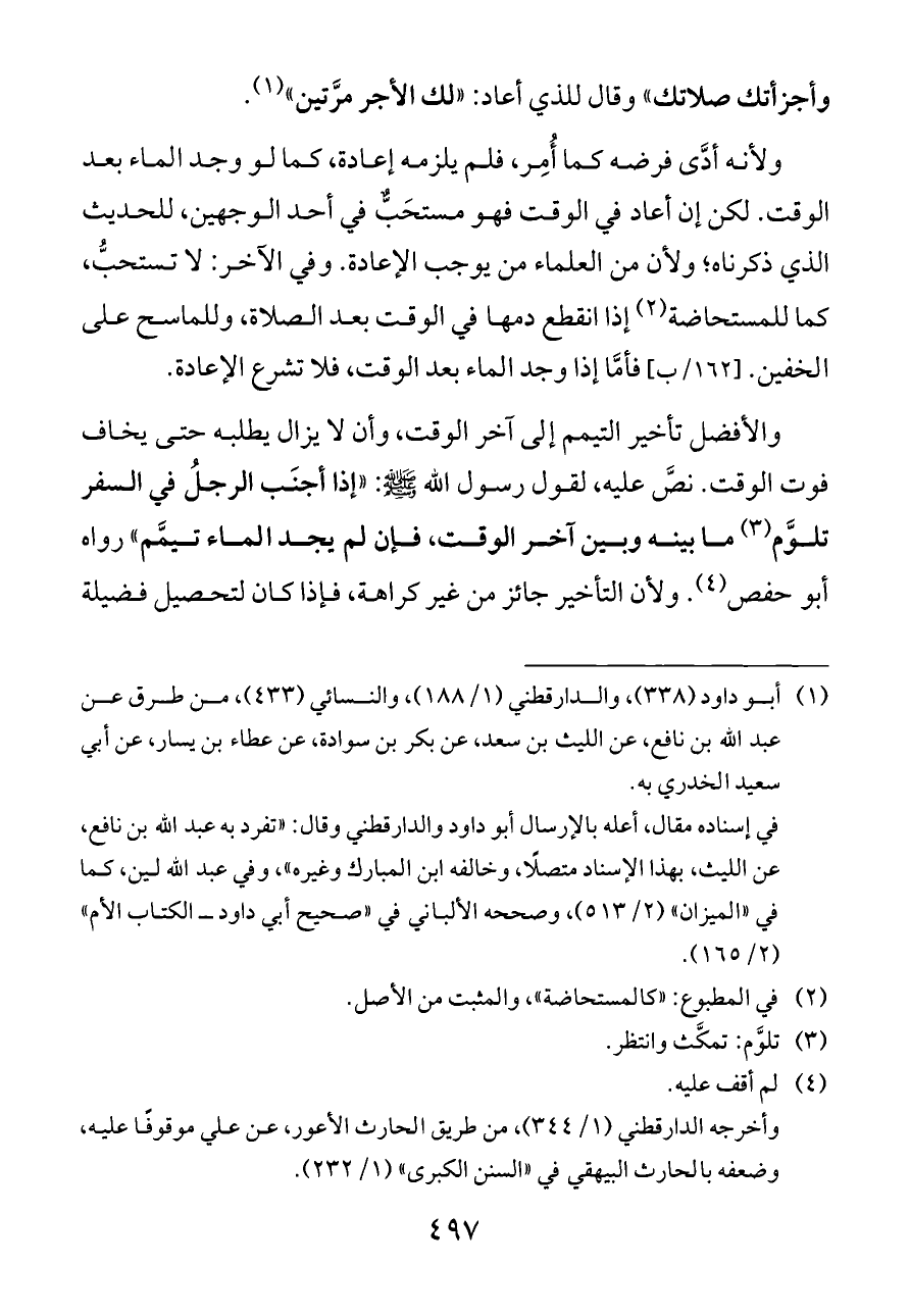 ولأنه أدَّى فرضه كما أُمِر، فلم يلزمه إعادة، كما لو وجد الماء بعد الوقت. لكن إن أعاد في الوقت فهو مستحَبٌّ في أحد الوجهين، للحديث الذي ذكرناه؛ ولأن من العلماء من يوجب الإعادة. وفي الآخر: لا تستحبُّ، كما للمستحاضة (¬٢) إذا انقطع دمها في الوقت بعد الصلاة، وللماسح على الخفين. [١٦٢/ب] فأمَّا إذا وجد الماء بعد الوقت، فلا تشرع الإعادة.