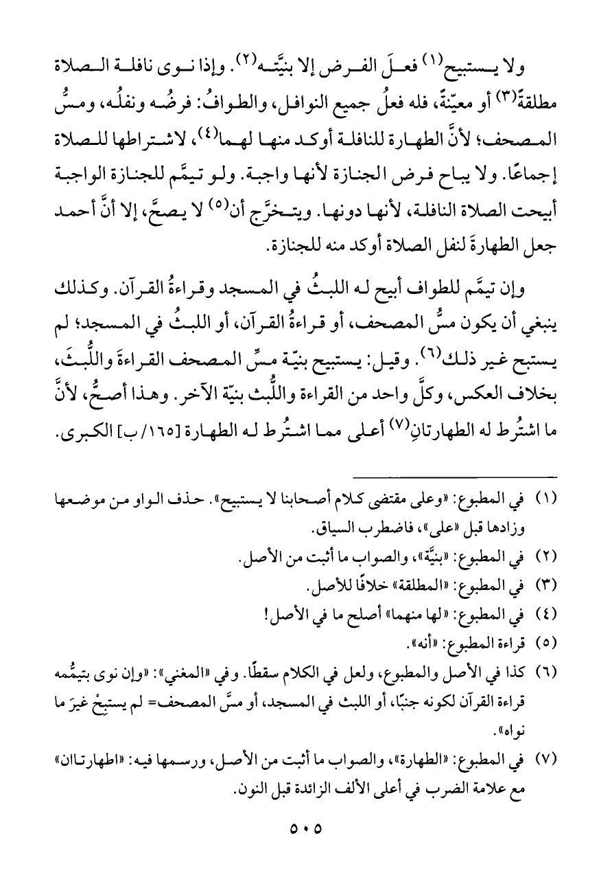 وإن تيمَّم للطواف أبيح له اللبثُ في المسجد وقراءةُ القرآن. وكذلك ينبغي أن يكون مسُّ المصحف، أو قراءةُ القرآن، أو اللبثُ في المسجد؛ لم يستبح غير ذلك (¬٦). وقيل: يستبيح بنيّة مسِّ المصحف القراءةَ واللُّبثَ، بخلاف العكس، وكلَّ واحد من القراءة واللُّبث بنيّة الآخر. وهذا أصحُّ، لأنَّ ما اشتُرط له الطهارتانِ (¬٧) أعلى مما اشتُرط له الطهارة [١٦٥/ب] الكبرى.