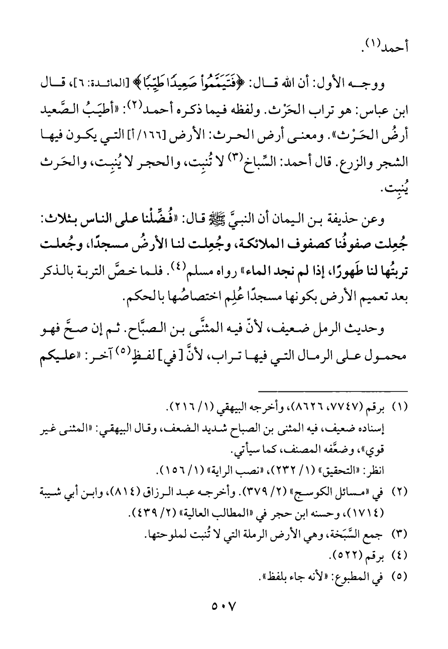 وحديث الرمل ضعيف، لأنّ فيه المثنَّى بن الصبَّاح. ثم إن صحَّ فهو محمول على الرمال التي فيها تراب، لأنَّ [في] لفظٍ (¬٥) آخر: «عليكم