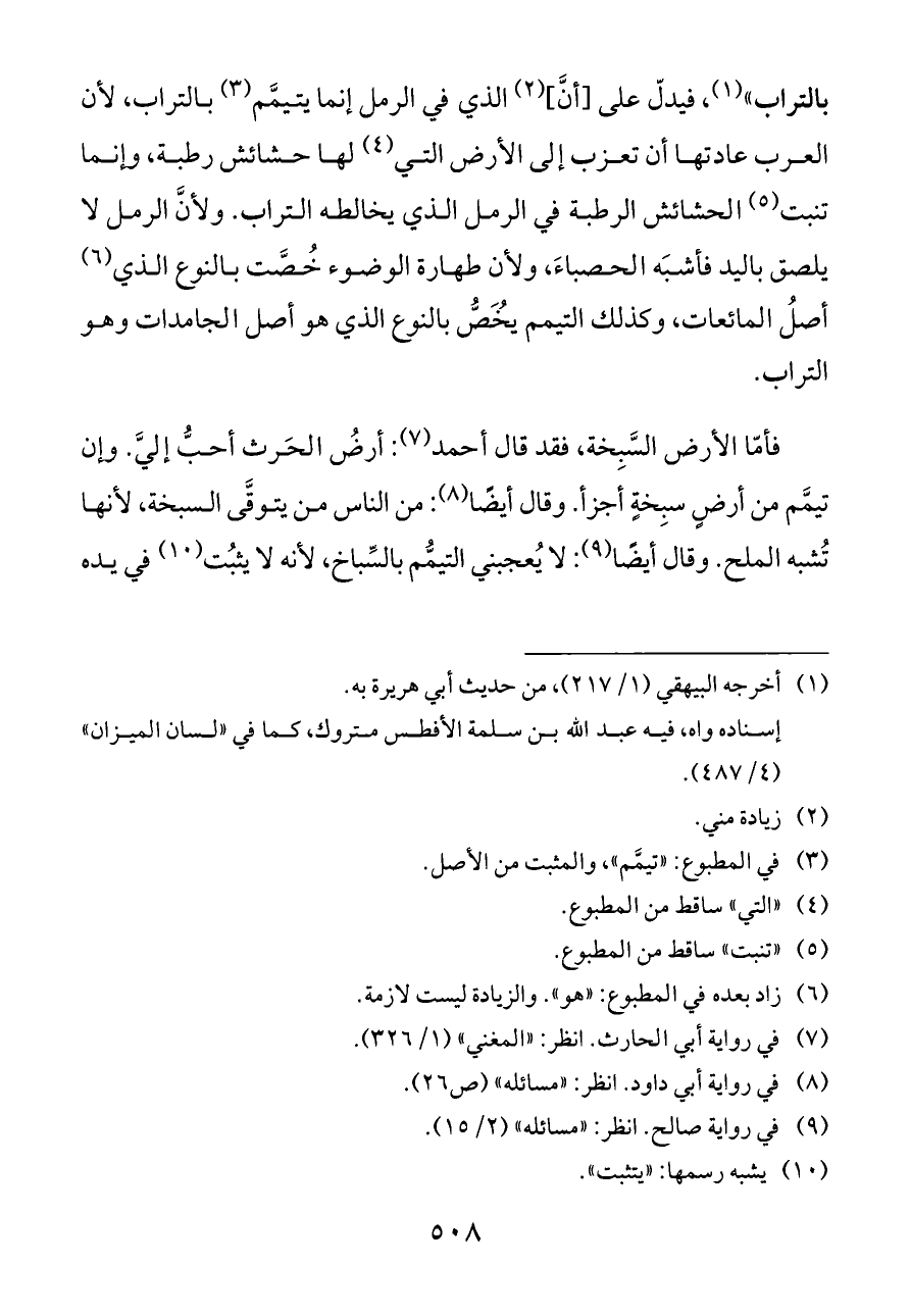 فأمّا الأرض السَّبِخة، فقد قال أحمد (¬٧): أرضُ الحَرث أحبُّ إليَّ. وإن تيمَّم من أرضٍ سبِخةٍ أجزأ. وقال أيضًا (¬٨): من الناس من يتوقَّى السبخة، لأنها تُشبه الملح. وقال أيضًا (¬٩): لا يُعجبني التيمُّم بالسِّباخ، لأنه لا يثبُت (¬١٠) في يده