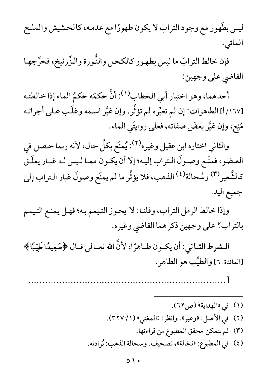 فإن خالط الترابَ ما ليس بطهور كالكحل والنُّورة والزِّرنيخ، فخرَّجها القاضي على وجهين: