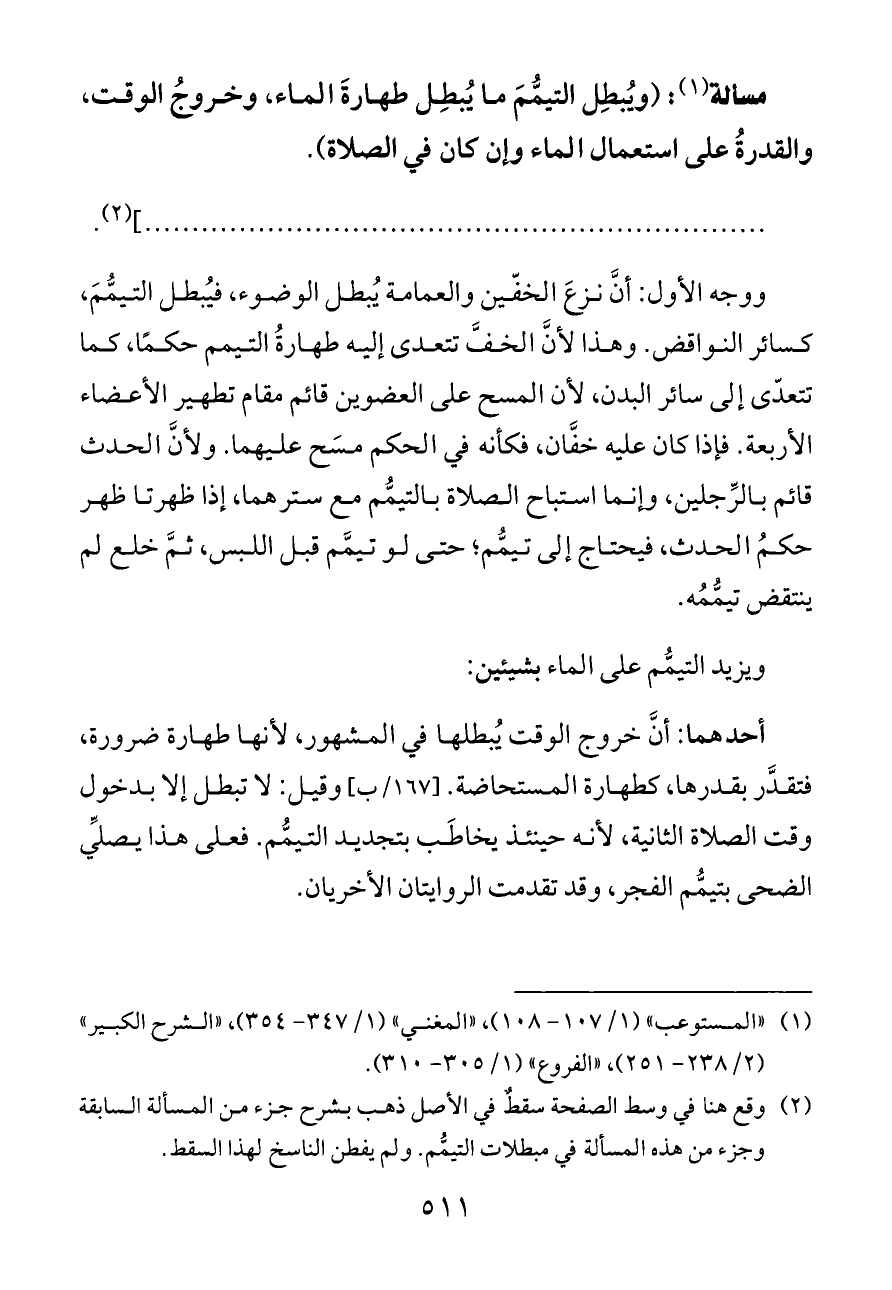 (¬٢) وقع هنا في وسط الصفحة سقطٌ في الأصل ذهب بشرح جزء من المسألة السابقة وجزء من هذه المسألة في مبطلات التيمُّم. ولم يفطن الناسخ لهذا السقط.