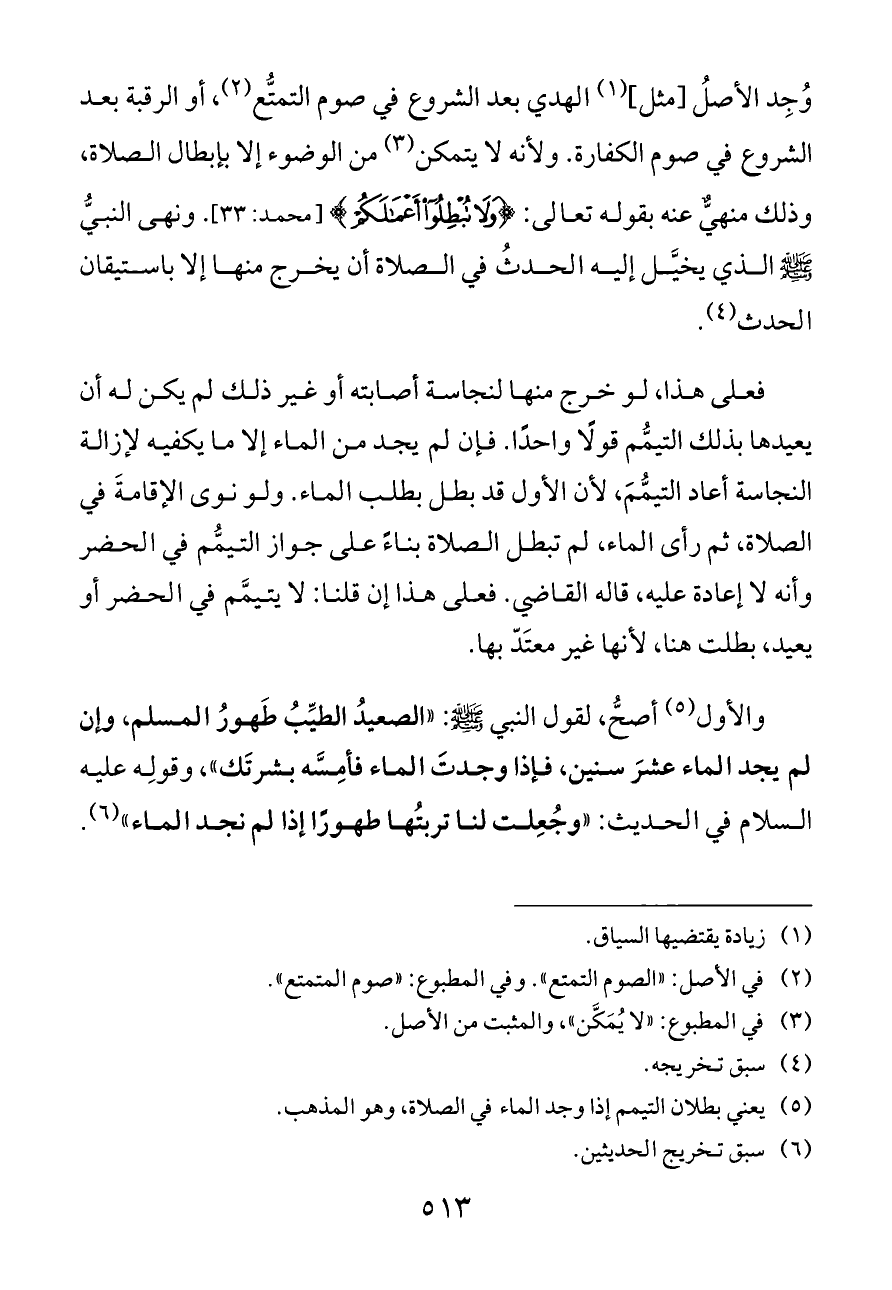 وُجِد الأصلُ [مثل] (¬١) الهدي بعد الشروع في صوم التمتُّع (¬٢)، أو الرقبة بعد الشروع في صوم الكفارة. ولأنه لا يتمكن (¬٣) من الوضوء إلا بإبطال الصلاة، وذلك منهيٌّ عنه بقوله تعالى: {وَلَا تُبْطِلُوا أَعْمَالَكُمْ} [محمد: ٣٣]. ونهى النبيُّ - صلى الله عليه وسلم - الذي يخيَّل إليه الحدثُ في الصلاة أن يخرج منها إلا باستيقان الحدث (¬٤).