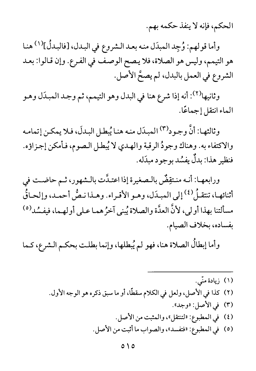 وأما قولهم: وُجِد المبدَل منه بعد الشروع في البدل، [فالبدلُ] (¬١) هنا هو التيمم، وليس هو الصلاة، فلا يصح الوصف في الفرع. وإن قالوا: بعد الشروع في العمل بالبدل، لم يصحَّ الأصل.