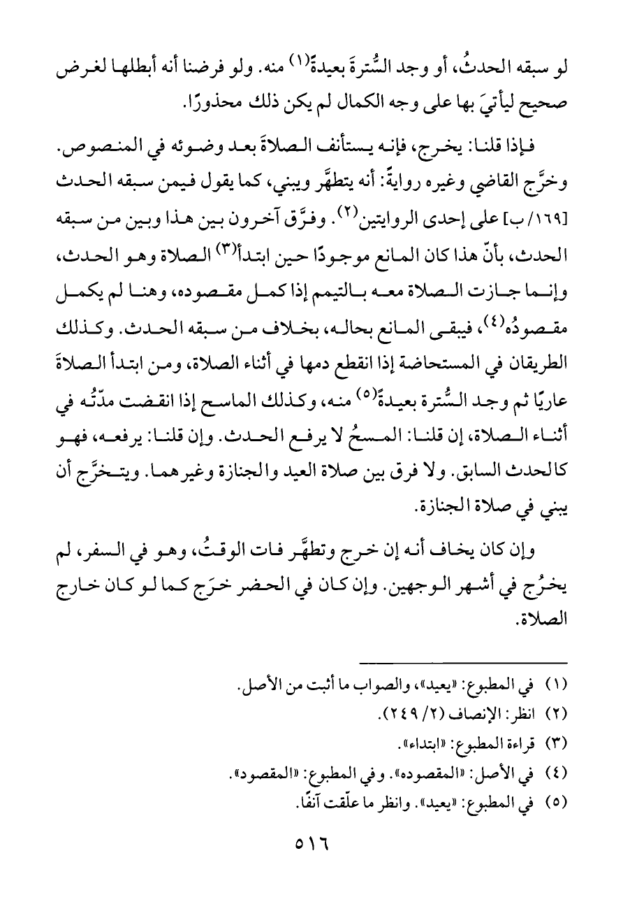 فإذا قلنا: يخرج، فإنه يستأنف الصلاةَ بعد وضوئه في المنصوص. وخرَّج القاضي وغيره روايةً: أنه يتطهَّر ويبني، كما يقول فيمن سبقه الحدث [١٦٩/ب] على إحدى الروايتين (¬٢). وفرَّق آخرون بين هذا وبين من سبقه الحدث، بأنّ هذا كان المانع موجودًا حين ابتدأ (¬٣) الصلاة وهو الحدث، وإنما جازت الصلاة معه بالتيمم إذا كمل مقصوده، وهنا لم يكمل مقصودُه (¬٤)، فيبقى المانع بحاله، بخلاف من سبقه الحدث. وكذلك الطريقان في المستحاضة إذا انقطع دمها في أثناء الصلاة، ومن ابتدأ الصلاةَ عاريًا ثم وجد السُّترة بعيدةً (¬٥) منه، وكذلك الماسح إذا انقضت مدّتُه في أثناء الصلاة، إن قلنا: المسحُ لا يرفع الحدث. وإن قلنا: يرفعه، فهو كالحدث السابق. ولا فرق بين صلاة العيد والجنازة وغيرهما. ويتخرَّج أن يبني في صلاة الجنازة.