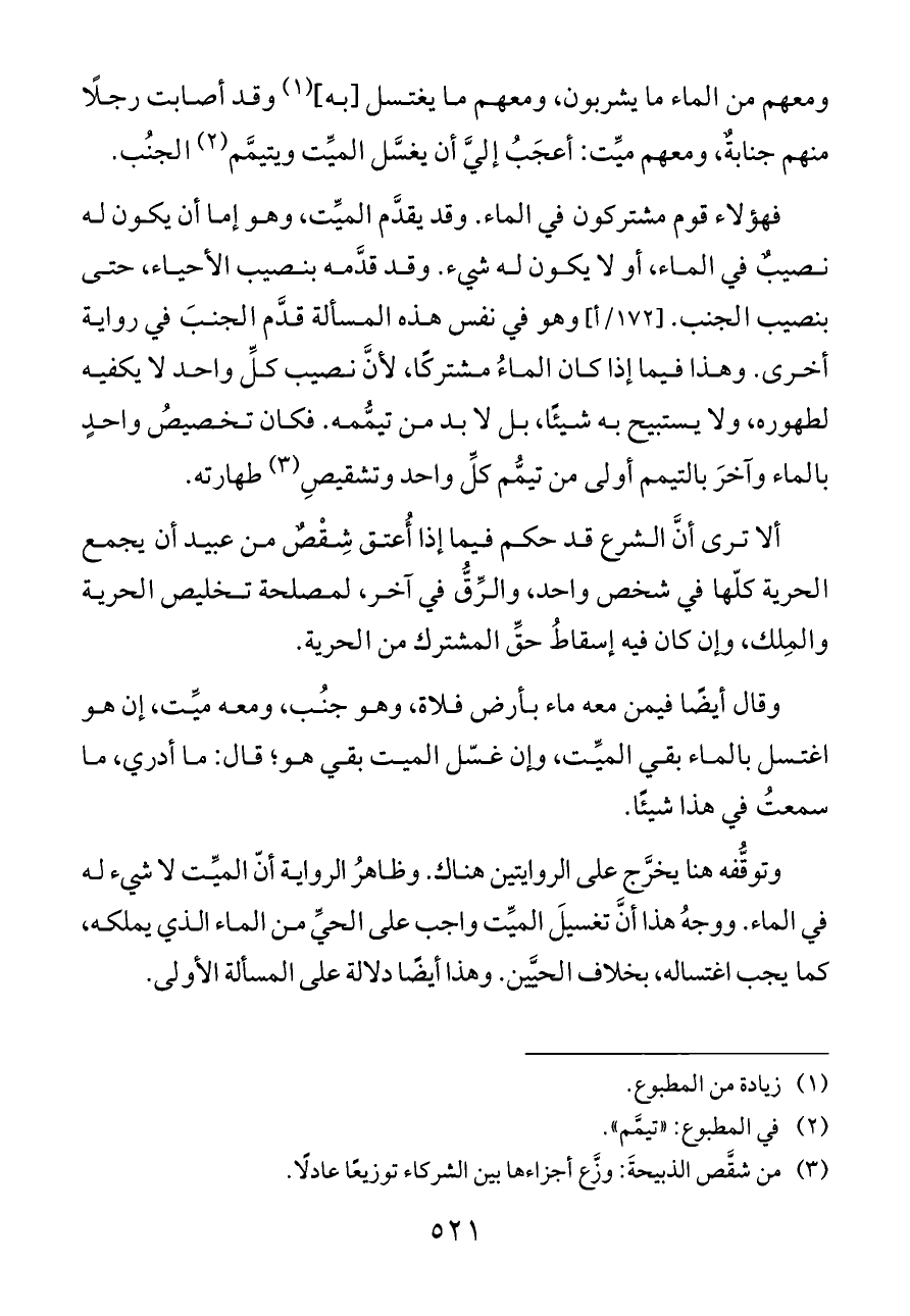 فهؤلاء قوم مشتركون في الماء. وقد يقدَّم الميِّت، وهو إما أن يكون له نصيبٌ في الماء، أو لا يكون له شيء. وقد قدَّمه بنصيب الأحياء، حتى بنصيب الجنب. [١٧٢/أ] وهو في نفس هذه المسألة قدَّم الجنبَ في رواية أخرى. وهذا فيما إذا كان الماءُ مشتركًا، لأنَّ نصيب كلِّ واحد لا يكفيه لطهوره، ولا يستبيح به شيئًا، بل لا بد من تيمُّمه. فكان تخصيصُ واحدٍ بالماء وآخرَ بالتيمم أولى من تيمُّم كلِّ واحد وتشقيصِ (¬٣) طهارته.