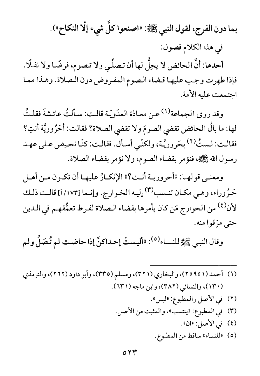وقد روى الجماعة (¬١) عن معاذة العدَويّة قالت: سألتُ عائشةَ فقلتُ لها: ما بالُ الحائض تقضي الصومَ ولا تقضي الصلاة؟ فقالت: أحَرُوريَّة أنتِ؟ فقالت: لستُ (¬٢) بحَروريَّة، ولكنّي أسأل. فقالت: كنّا نحيض على عهد رسول الله - صلى الله عليه وسلم -، فنؤمر بقضاء الصوم، ولا نؤمر بقضاء الصلاة.