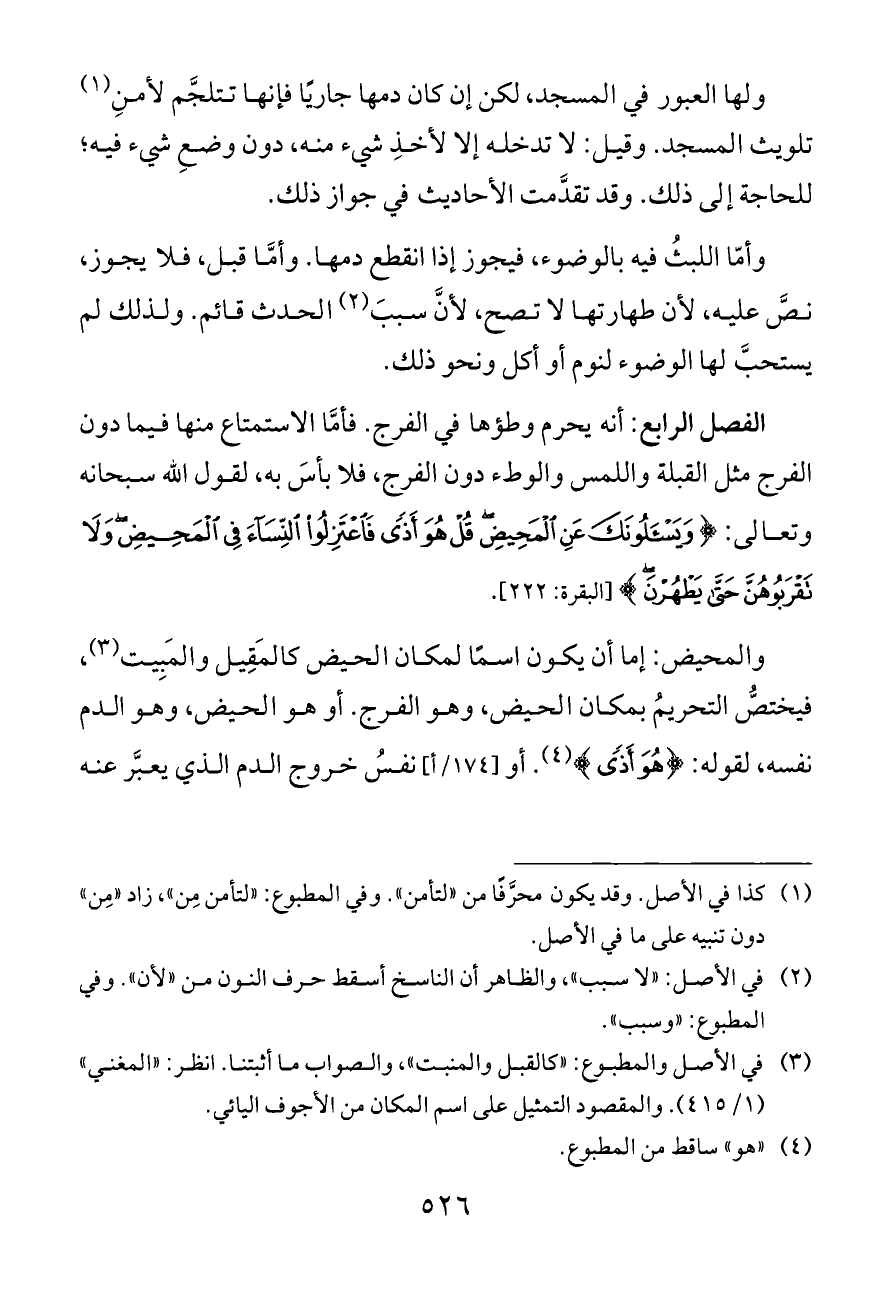 والمحيض: إما أن يكون اسمًا لمكان الحيض كالمَقِيل والمَبِيت (¬٣)، فيختصُّ التحريمُ بمكان الحيض، وهو الفرج. أو هو الحيض، وهو الدم نفسه، لقوله: {هُوَ أَذًى} (¬٤). أو [١٧٤/أ] نفسُ خروج الدم الذي يعبَّر عنه