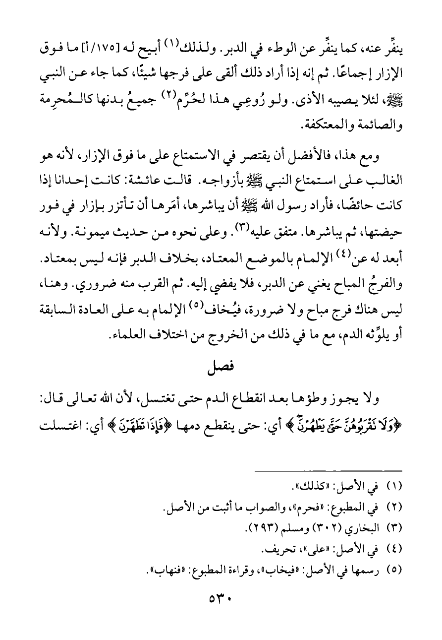 ومع هذا، فالأفضل أن يقتصر في الاستمتاع على ما فوق الإزار، لأنه هو الغالب على استمتاع النبي - صلى الله عليه وسلم - بأزواجه. قالت عائشة: كانت إحدانا إذا كانت حائضًا، فأراد رسول الله - صلى الله عليه وسلم - أن يباشرها، أمَرها أن تأتزر بإزار في فور حيضتها، ثم يباشرها. متفق عليه (¬٣). وعلى نحوه من حديث ميمونة. ولأنه أبعد له عن (¬٤) الإلمام بالموضع المعتاد، بخلاف الدبر فإنه ليس بمعتاد. والفرجُ المباح يغني عن الدبر، فلا يفضي إليه. ثم القرب منه ضروري. وهنا، ليس هناك فرج مباح ولا ضرورة، فيُخاف (¬٥) الإلمام به على العادة السابقة أو يلوِّثه الدم، مع ما في ذلك من الخروج من اختلاف العلماء.