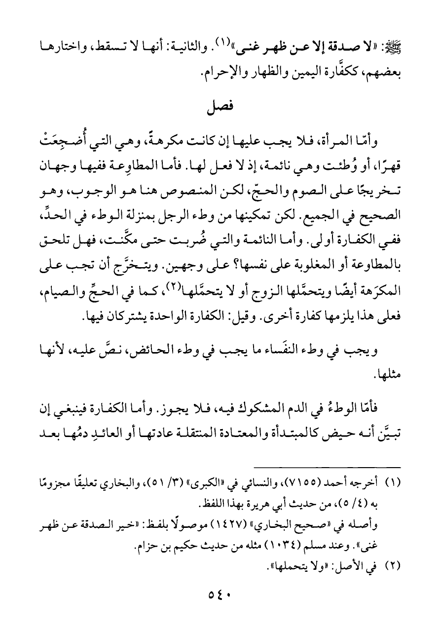 وأمّا المرأة، فلا يجب عليها إن كانت مكرهةً، وهي التي أُضجِعَتْ قهرًا، أو وُطئت وهي نائمة، إذ لا فعل لها. فأما المطاوِعة ففيها وجهان تخريجًا على الصوم والحجّ، لكن المنصوص هنا هو الوجوب، وهو الصحيح في الجميع. لكن تمكينها من وطء الرجل بمنزلة الوطء في الحدِّ، ففي الكفارة أولى. وأما النائمة والتي ضُربت حتى مكَّنت، فهل تلحق بالمطاوعة أو المغلوبة على نفسها؟ على وجهين. ويتخرَّج أن تجب على المكرَهة أيضًا ويتحمَّلها الزوج أو لا يتحمَّلها (¬٢)، كما في الحجِّ والصيام، فعلى هذا يلزمها كفارة أخرى. وقيل: الكفارة الواحدة يشتركان فيها.
